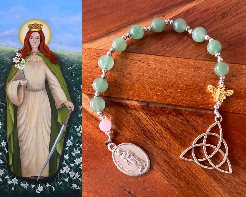 I chose a bee as a reminder that we are never truly alone in our struggles; there are a host of unseen guardians around us that await our request for help and guidance. Not the least of which are Our Lady and St. Dymphna, the patron saint of depression, anxiety, and mental illness. The bee is also a rich symbol in Celtic spirituality.