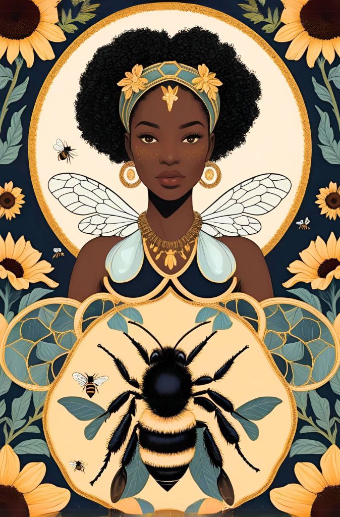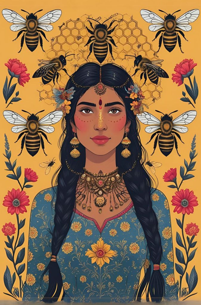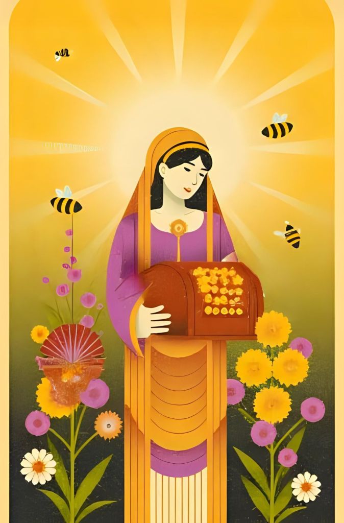 Being me, I didn’t want an image of Our Lady of Bees to be the generic white lady that I grew up with. She’s lovely, but so is diversity. She has SO many faces and aspects! The first image I generated (with the help of Ai) is a brown skinned woman of middle eastern heritage. More versions below.